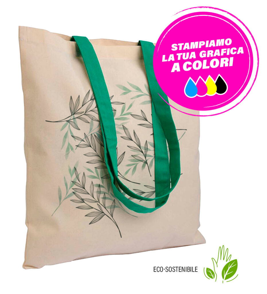 Shopper in Cotone 38x42cm con Manici Lunghi da 70cm. Shopping Bag Personalizzabili con la tua grafica a colori su 1 o 2 Lati – a partire da 25pz.
