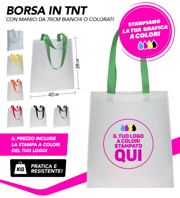 Shopper in TNT 38x42cm con Manici Lunghi da 70cm. Shopping Bag Personalizzabili con la tua grafica a colori su 1 o 2 Lati – a partire da 25pz.