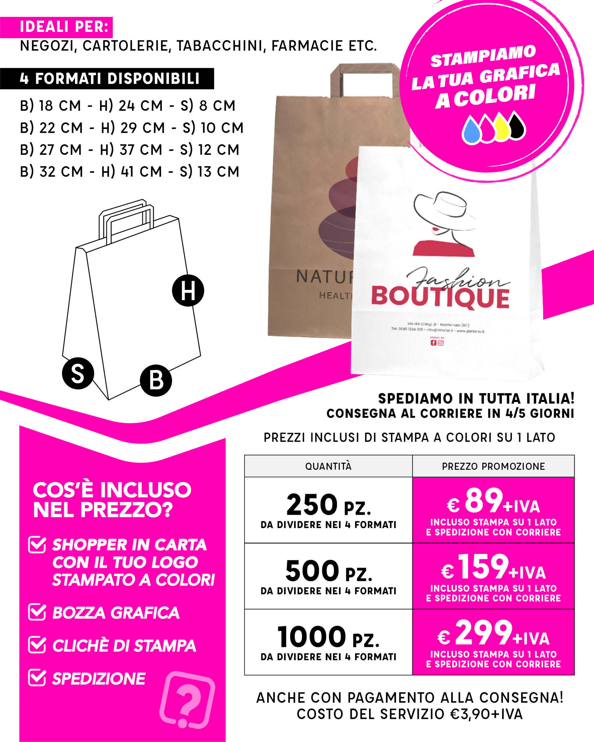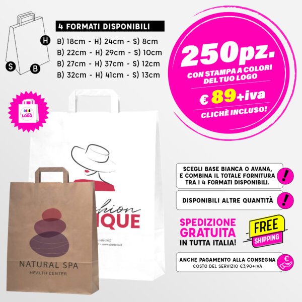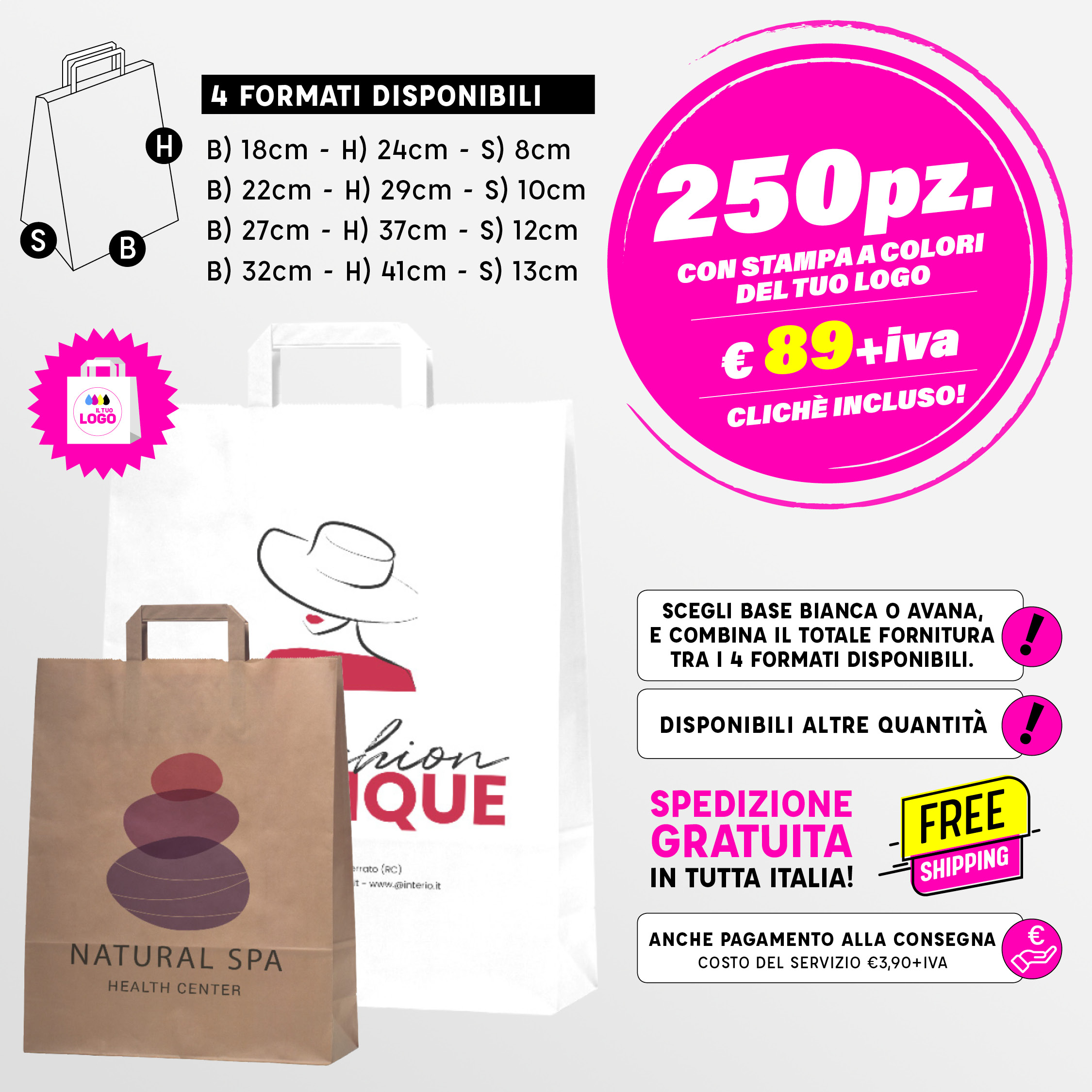 Kit Risparmio – Shopper in Carta Kraft Maniglia Piatta. Si possono avere in 3 quantità, 250 – 500 – 1.000pz. con un mix. tra i formati disponibili!