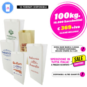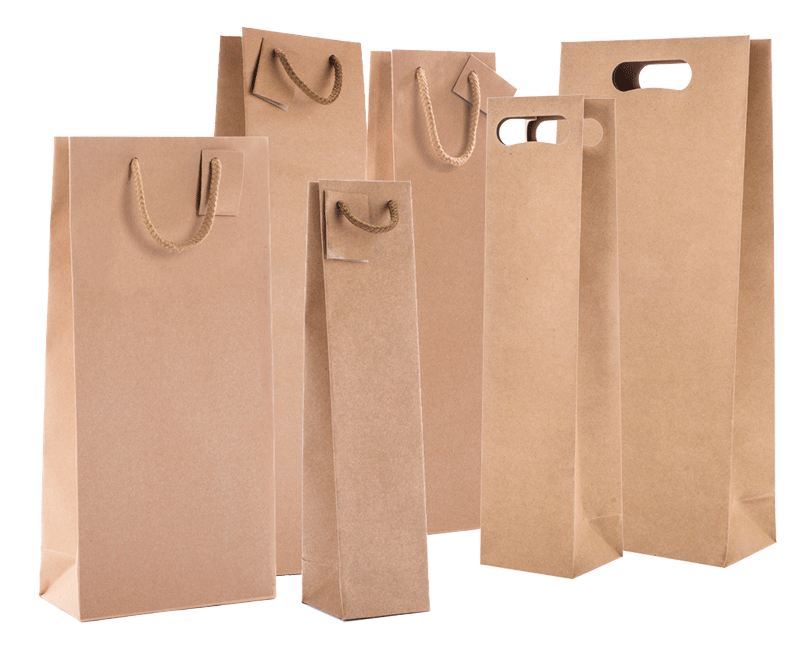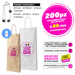 Cod. 47 – 7,2×31+6,8 cm (LxA + P) – Adatto per 1 Bottiglia Mini – Materiale: Carta Kraft Avana da 210gr. con maniglie in Cotone | Cod. 48 – 10×39+9 cm (LxA + P) – Adatto per 1 Bottiglia Normale – Materiale: Carta Kraft Avana o Bianca da 210gr. con maniglie in Cotone | Cod. 49 – 11,5×42+11,5 cm (LxA + P) – Adatto 1 una Bottiglia Magnum – Materiale: Carta Kraft Avana da 210gr. con maniglie in Cotone | Cod. 50 – 17,5×39+9 cm (LxA + P) – Adatto per 2 Bottiglie Normali – Materiale: Carta Kraft Avana o Bianca da 210gr. con maniglie in Cotone | Cod. 51 – 11×42+9 cm (LxA + P) – Adatto per 1 Bottiglie Normale – Materiale: Carta Kraft Avana da 210gr. con maniglie fustellata a Fagiolo | Cod. 52 – 18×42+9 cm (LxA + P) – Adatto per 2 Bottiglie Normali – Materiale: Carta Kraft Avana da 210gr. con maniglie fustellata a Fagiolo