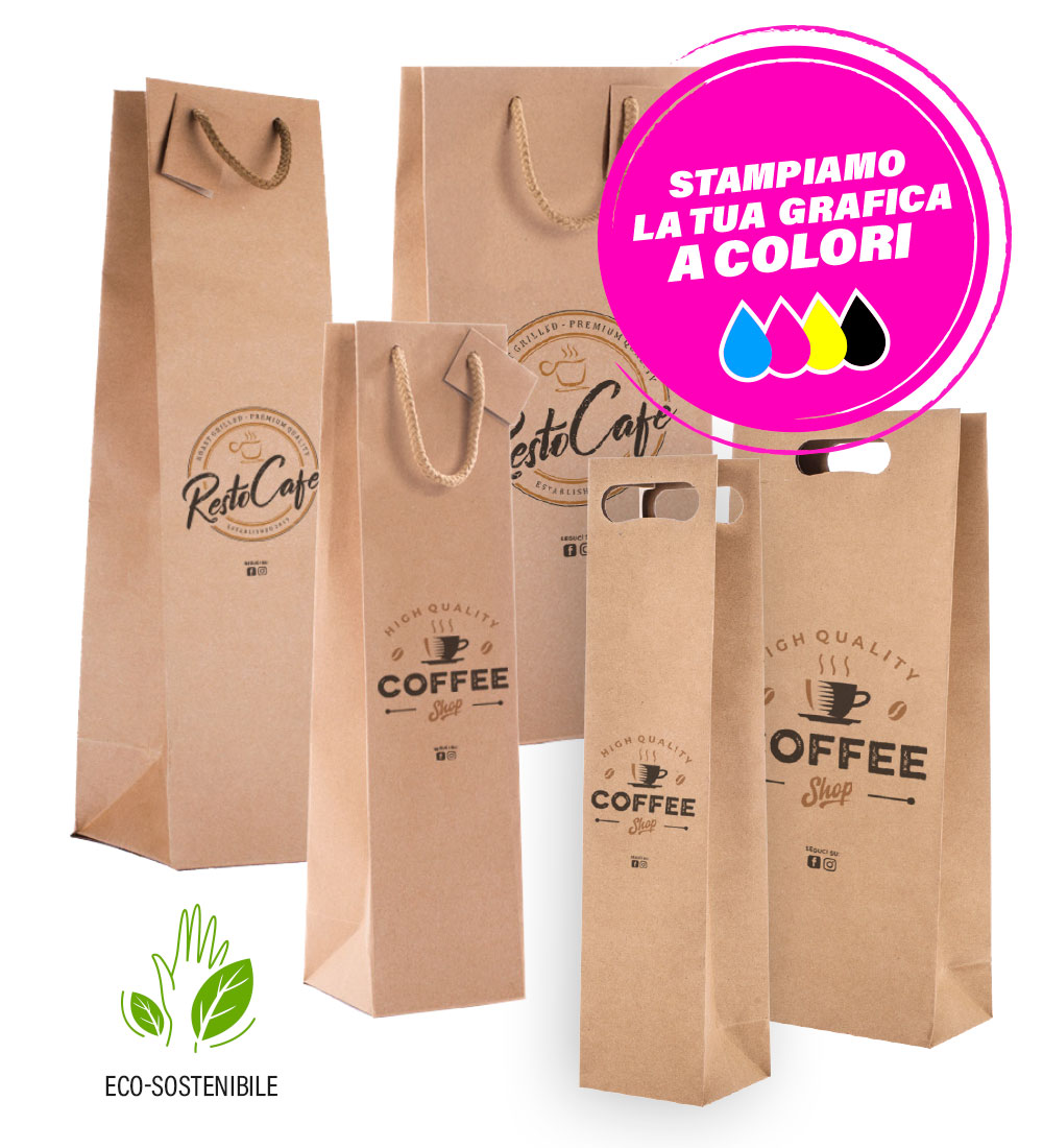 Veicola il Marchio della tua Enoteca, Bar o Market con le confezioni realizzate in materiale resistente ed ecologico, offrendo il tuo contributo per limitare l’utilizzo della plastica.