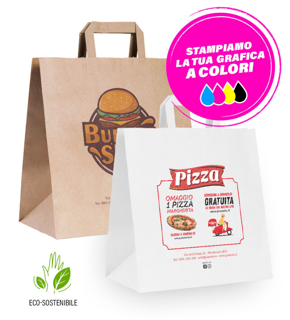 Shopper in Carta Kraft Maniglia Piatta, Fondo Largo adatte per l’asporto. Resistenti ed Ecosostenibili, disponibili in 3 Misure mati nei colori Bianco e Avana, Personalizzabili con la tua grafica a colori su 1 o 2 Lati – a partire da 100pz.